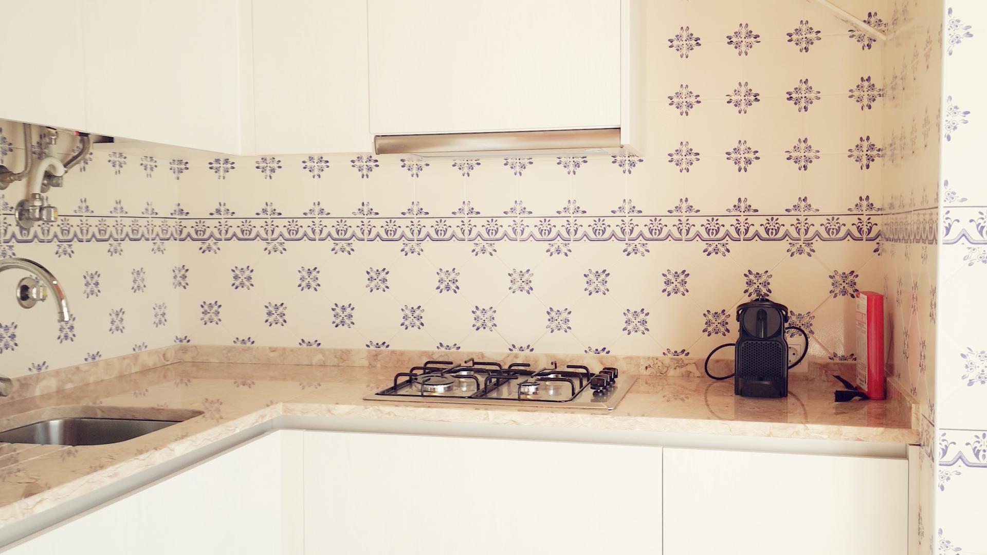 1 equipped kitchenette with stove, oven, microwave, refrigerator, coffee maker, dishes, pots and pans and other kitchen utensils, with access to small terrace with partial sea view