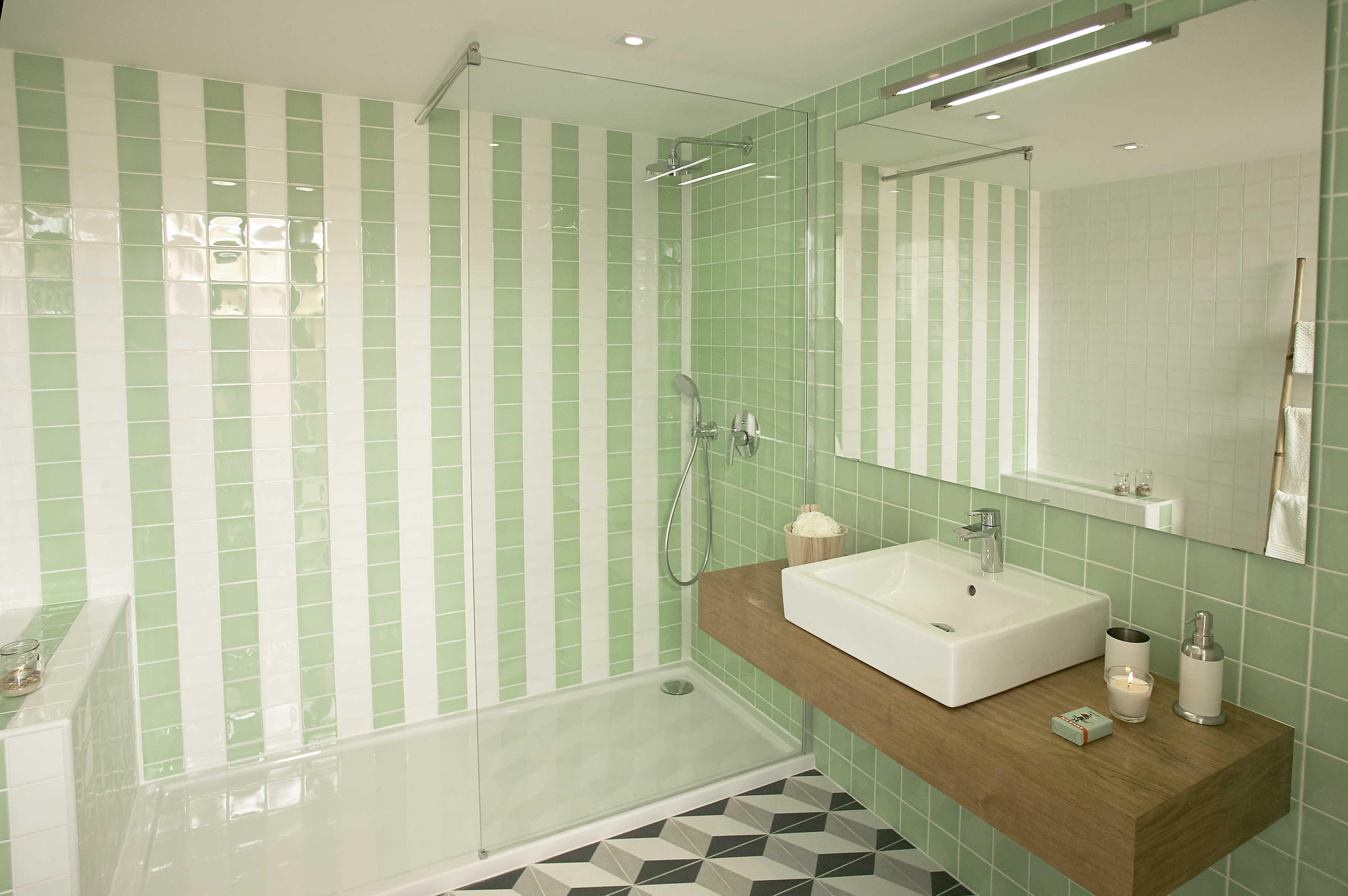 1 casa de banho com duche, lavatório e móvel, sanita, espelhos e secador de cabelo
