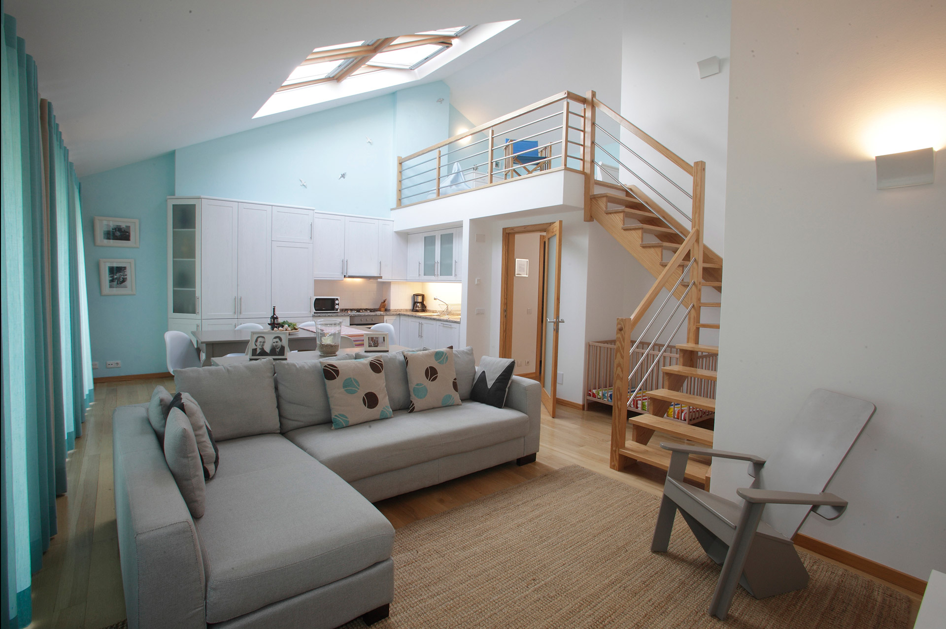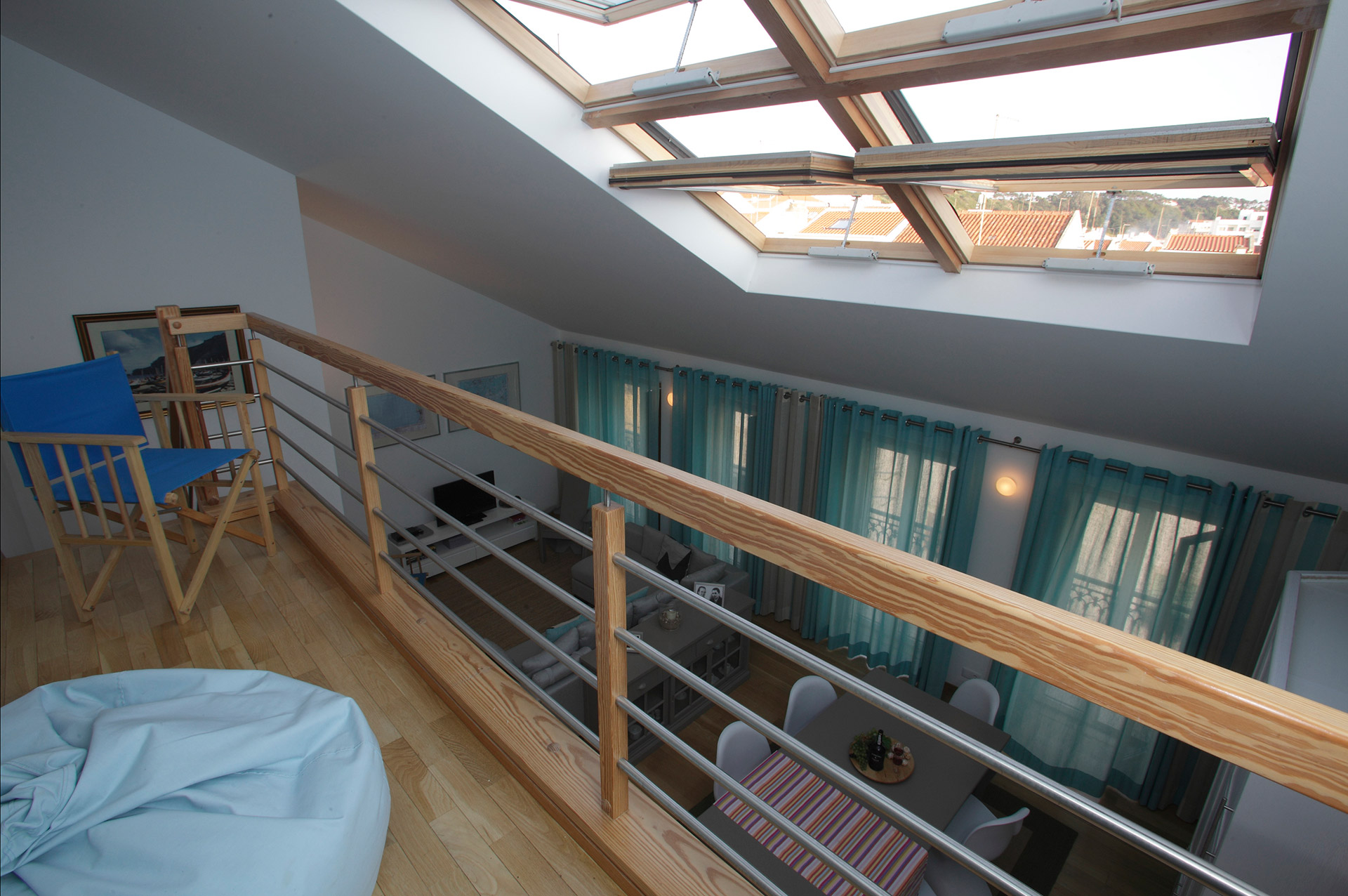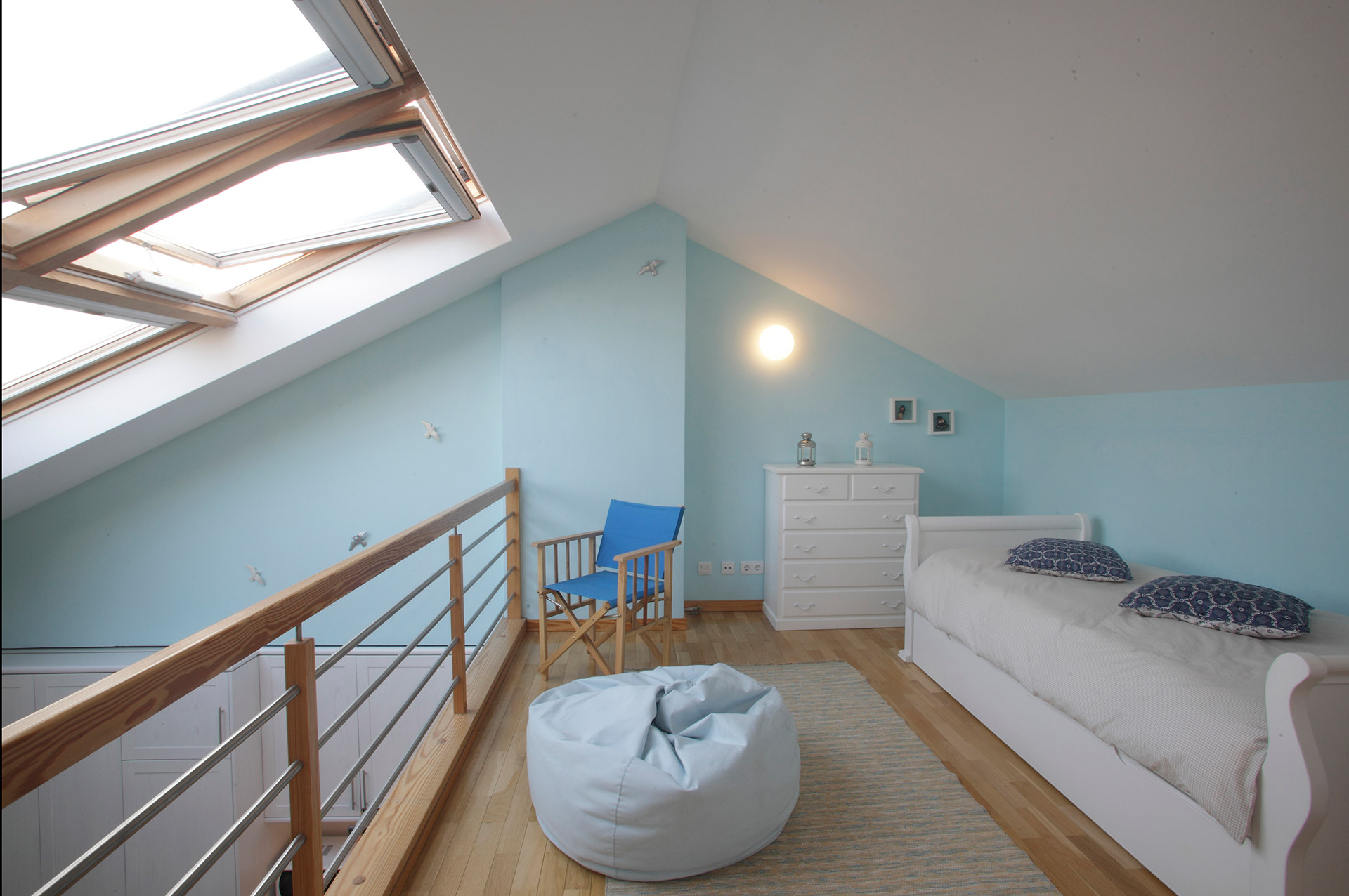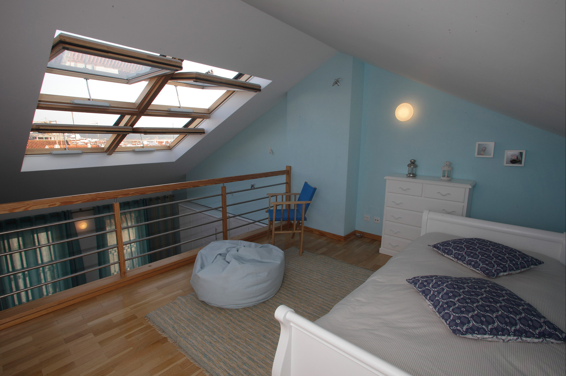 1 quarto em mezzanine, com duas camas single, cómoda e escrivaninha com cadeira, pouf