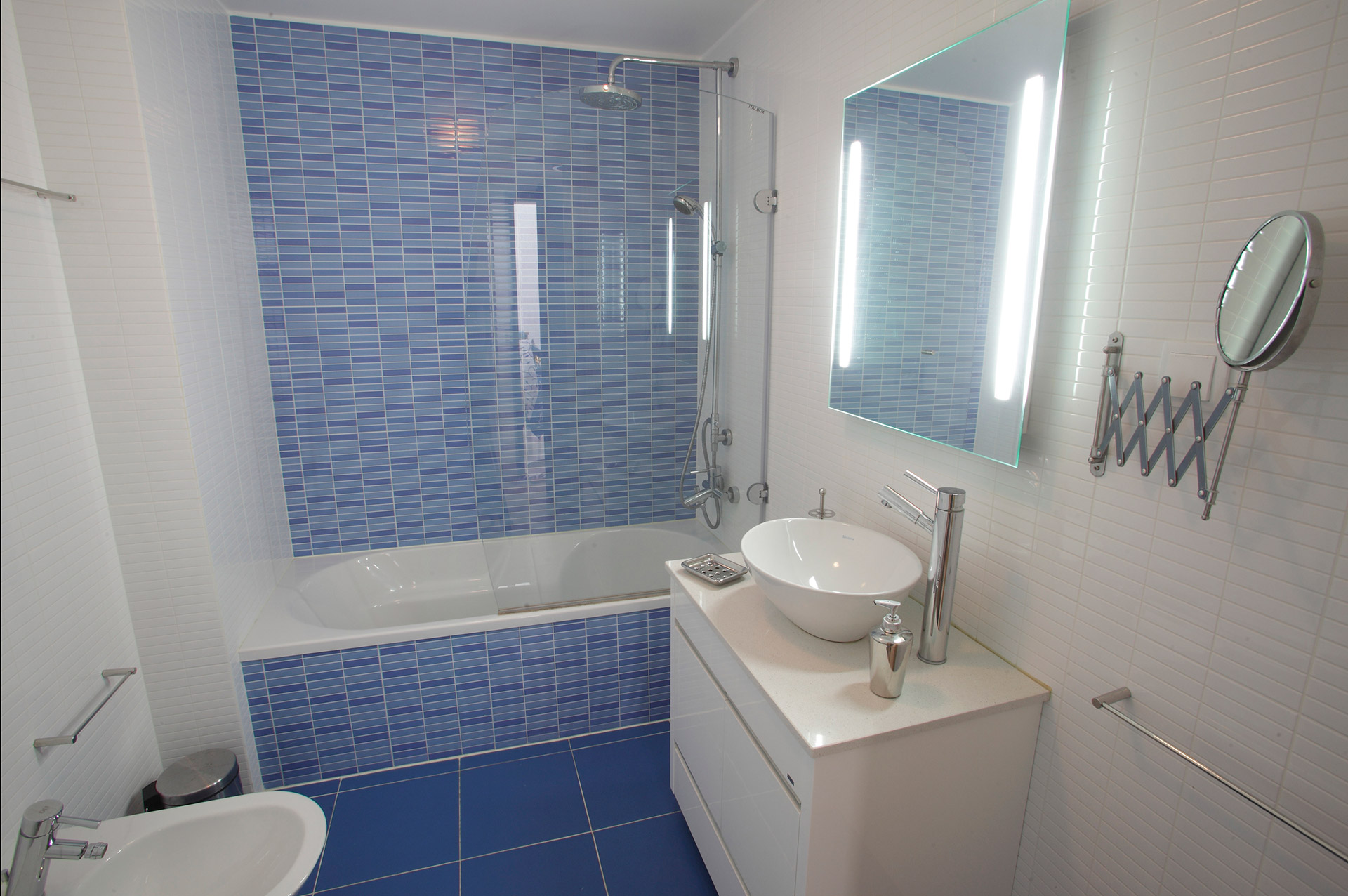 1 casa de banho com banheira e duche, lavatório e móvel, sanita e bidé, espelhos e secador de cabelo